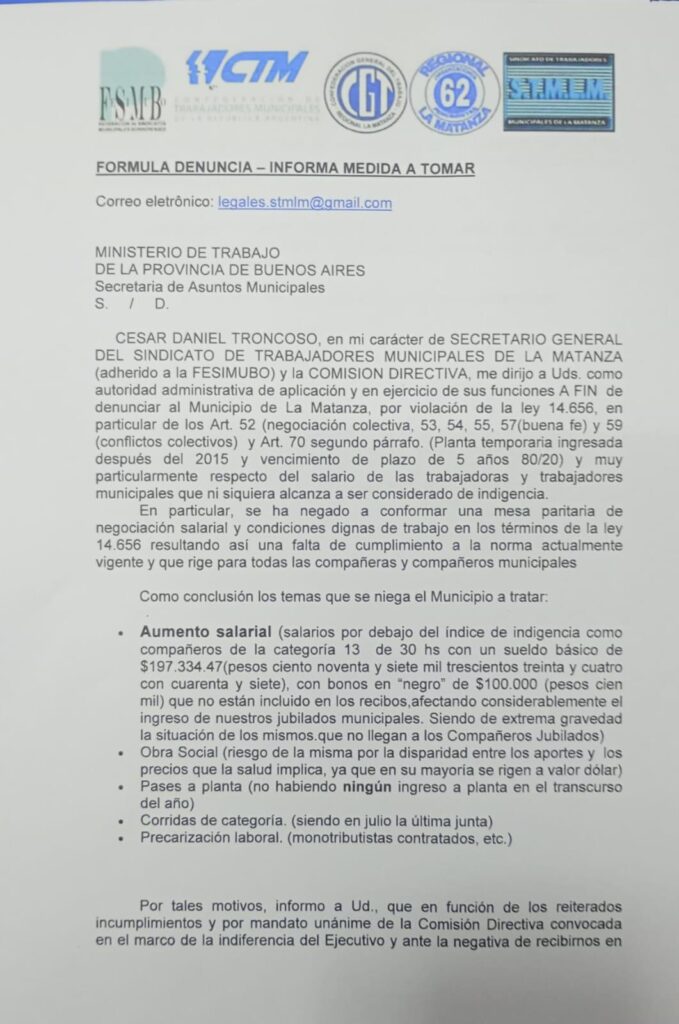 Además, Troncoso se refirió a la situación de los trabajadores municipales de La Matanza y reveló que el sindicato presentó una denuncia ante el Ministerio de Trabajo contra el Ejecutivo local.