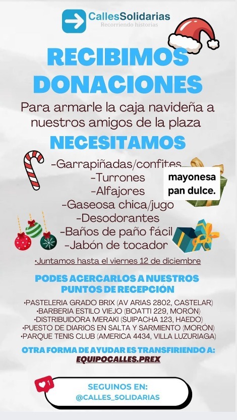 Para estas fiestas, Calles Solidarias está recolectando productos navideños como garrapiñada, pan dulce, turrón, y especialmente mayonesa, ya que, debido a las altas temperaturas, muchas de las personas que reciben ayuda preparan ensaladas y necesitan este condimento. “Es difícil de conseguir y muy necesario para poder seguir brindando una alimentación adecuada”, explicó Laura.