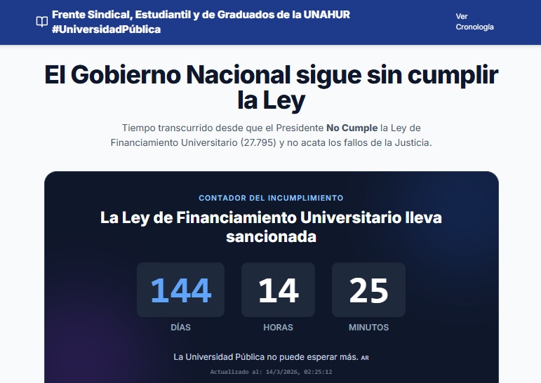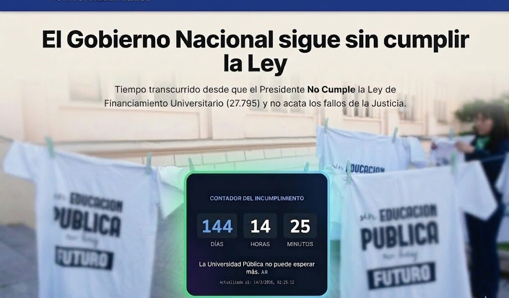 La iniciativa busca mostrar de manera permanente cuánto tiempo lleva sin cumplirse la normativa que establece mecanismos de actualización presupuestaria y recomposición salarial para docentes y trabajadores universitarios. Desde la institución señalaron que el objetivo es evidenciar el deterioro que atraviesan las universidades públicas ante la falta de ejecución de los recursos previstos por la ley.