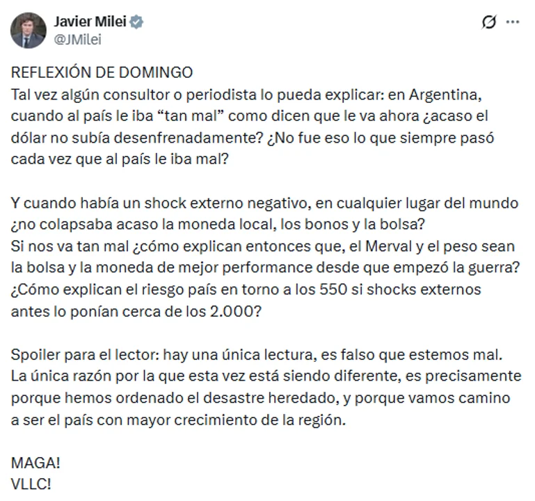 A través de un mensaje difundido en X, el mandatario buscó instalar una visión optimista basada en indicadores financieros, como la baja del riesgo país a la zona de los 550 puntos y la estabilidad cambiaria, en contraste con escenarios de crisis previos.