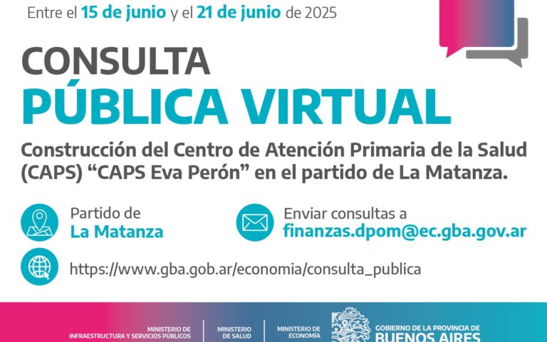 La Consulta Pública Virtual forma parte de la realización de la obra “Construcción del Centro deAtención Primaria de la Salud (CAPS) CAPS Eva Perón” en la localidad Gregorio de Laferrere / Partido de La Matanza.¿Qué es una Consulta Pública? Es un mecanismo de participación ciudadana, cuya finalidad es que la sociedad conozca y forme parte …